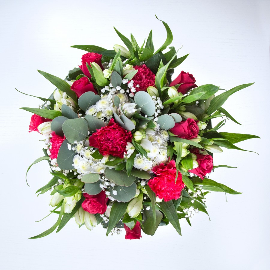 Indulge in the luxurious simplicity of this meticulously arranged bouquet. Featuring a stunning ensemble of scarlet red roses that pair beautifully with the pristine touch of white chrysanthemums, this design is accented by tender carnations and ethereal gypsophila. The inclusion of exquisite white alstroemeria and lush aspidistra leaves brings an added layer of refinement.